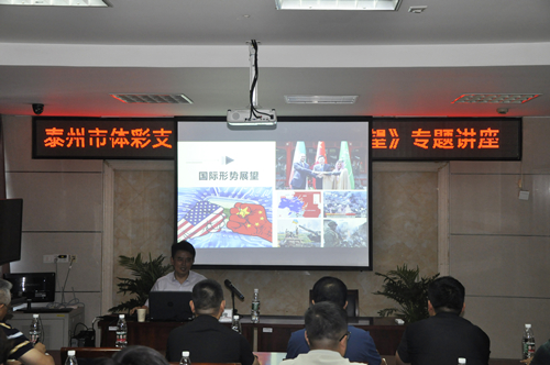 为深入学习贯彻习近平新时代中国特色社会主义思想,纪念中国人民解放军建军96周年,8月4日,泰州市体育局党委邀请泰州市委军民融合办副主任、市发改委党组成员、二级调研员、原江苏省军区教导大队大队长陈海俊同志作“国际形势展望”讲座,泰州市体育局机关支部、体校支部、体育中心支部的支部委员及泰州市体彩中心全体人员聆听了讲座。