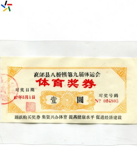 据陈庚林、夏阳先生调查,此枚奖券是1987年5月1日,八桥镇为举办“高邮县八桥镇第九届体运会”筹集资金而发行的。由于运动会设置的项目较多,包括田径、自行车、球类、棋类及趣味项目等,共36个单项,参加比赛的高达30多支代表队。为办好赛事活动,镇政府提出“群众体育群众办,办好体育大家玩”,于是以八桥镇农民体育协会名义发行的“八桥镇九体运体育奖券”在全镇推开了。