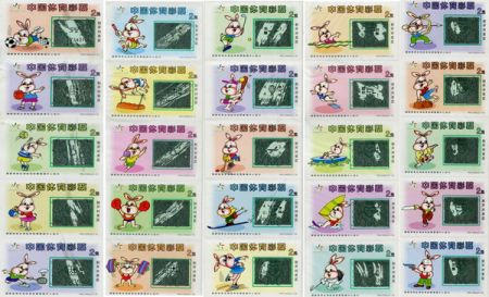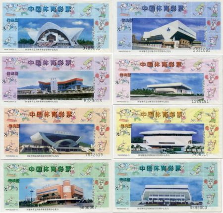 当年还有一套彩票上也出现过兔子的图案——9909CDZS广东体育场馆。这套彩票依旧使用了9901J30EQ上的兔年体育卡通图案作为票面的背景图,使得票面更加丰富多彩。