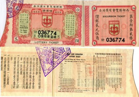 说起有奖入场券,其实早在建国前就已出现,记得有一天,当我翻开民国时期的彩集欣赏时,看到了一套民国时期浙江省政府发行的“西湖博览会有奖游券”映在眼前。此券发行于1929年,红底黑字,上方印有“西湖博览会有奖游券”,中间是西湖景点“三潭映月”,领奖证为第一期第二条,对奖号码036774;有奖游券每套包括存根、领奖证及游券;领奖证为