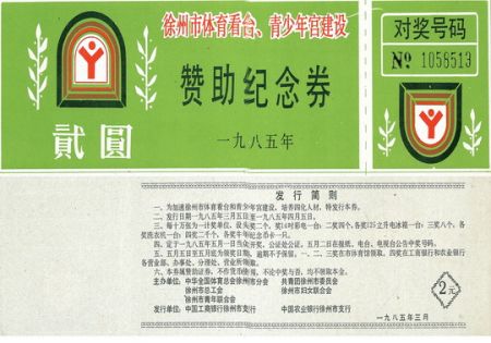 为了新建体育场馆,改善体育赛事和全民健身条件,扬中、海安、吴县、武进等体育部门先后发行了游泳池、体育馆建设及体育奖券;盐城地区红十字会为了支持国际体育援助计划,发行了盐城地区“88国际体育援助计划募捐奖券”,此奖券为全国统一部署,其发行宗旨及奖券格式、色彩、面值等要求基本一致。