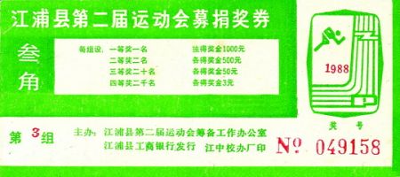 为承办全国第三届大学生运动会,江苏省于1988年发行了“中华人民共和国第三届大学生运动会体育基金募捐奖券”,此奖券面值为五角,票面正中是明显的奖级设置,左边是吉祥物,右边是会徽,背面印有“章程”,奖券共发行了十期,是由江苏省农业银行代理发行的。