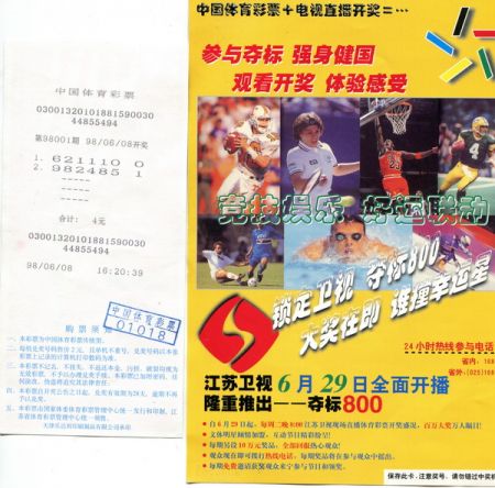 江苏省五环彩票博物馆在开馆之际,加字“9809CES电脑票”作为纪念票,一是因为这套电脑票是江苏省首发票,具有极高的纪念价值,二是这一套电脑票起,走上江苏卫视,并隆重推出--夺标800,自此,体育彩票进入全国电视媒体。(华明)