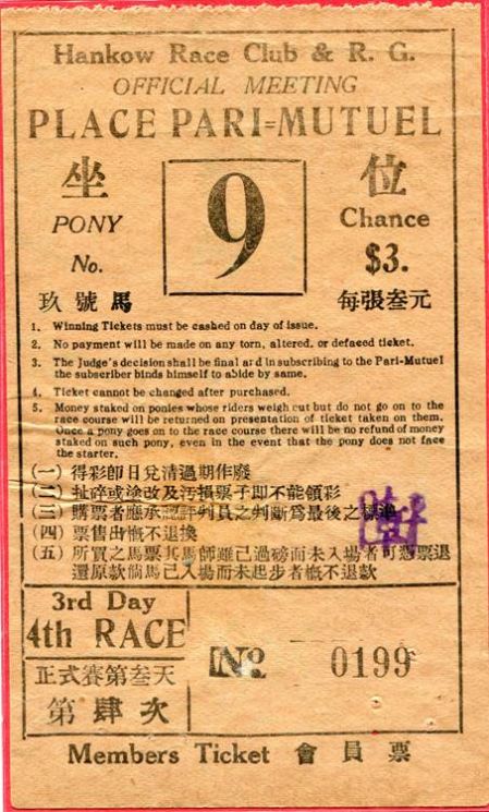 据资料记载,清光绪三十一年(1905年),英商在汉口经营跑马场,1926年-1939年汉口已有西商、华商、万国三个跑马场,赛马风气盛行,是汉口赛马鼎盛时期。为增加财政收入,1928年市财政局开征赛马捐,1932年市政府制定了《赛马捐暂行规则》,1941年日军接管西商跑马场,成立赛马会,建国后,跑马活动被禁止。如今,武汉建立了武汉“东方赛马城”,并连续举办了赛马节,试行了赛马竞猜活动,其竞猜方法是凭入场券领取选猜的马号券,每场赛事结束马匹成绩公布后,看所持马号券与第一名的马匹号码相同,即为中奖。(华明)