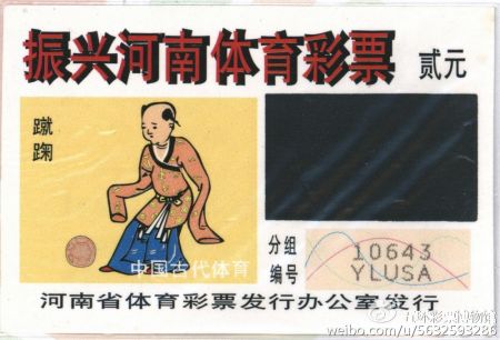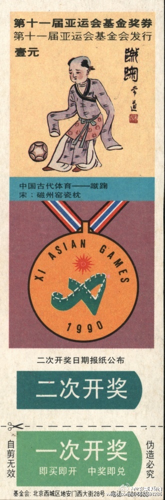 1989年8月8日,由第十一届亚运会基金会发行的《第十一届亚运会基金奖券》彩票品种多达12组198枚,至今仍保持着我国彩票发行史上单次品种与数量最多的最高纪录。彩票图案包刮吉祥物与亚运史、吉祥物与日历、邮票与日历、体育馆体育场、邮票与赛马、中国古代体育经典壁画砖画等,其中就有1枚反映中国古代体育经典“蹴鞠”的彩票。