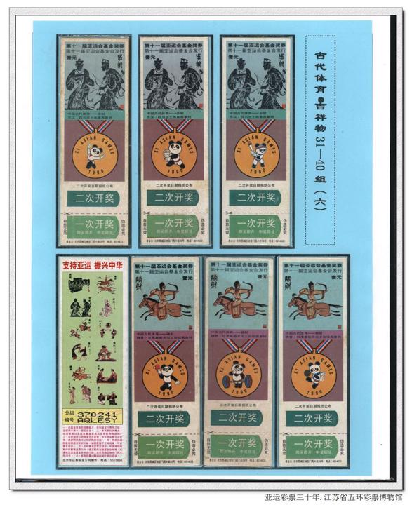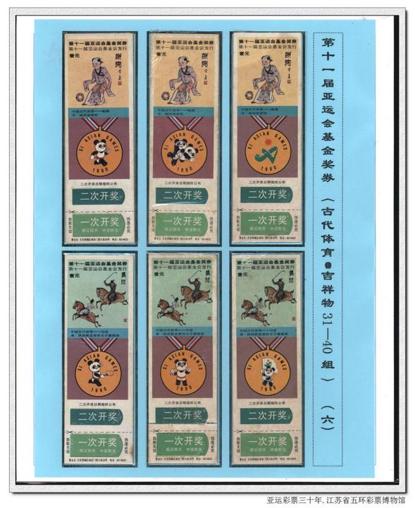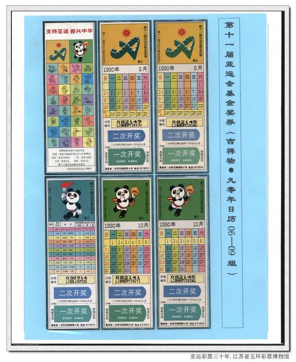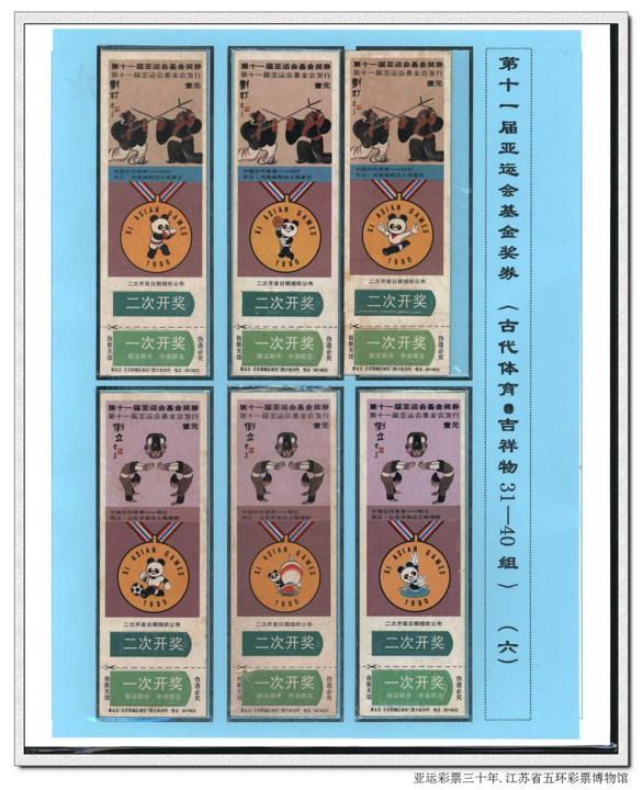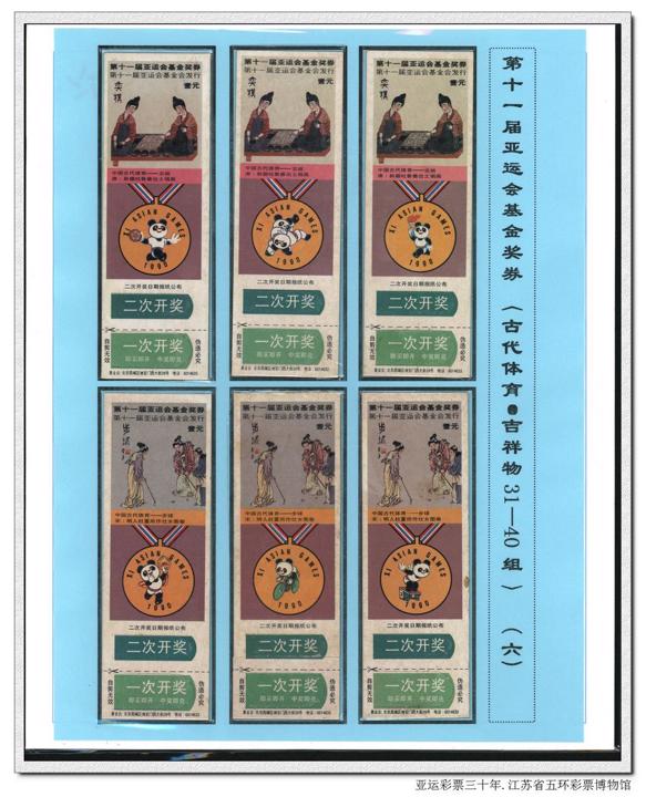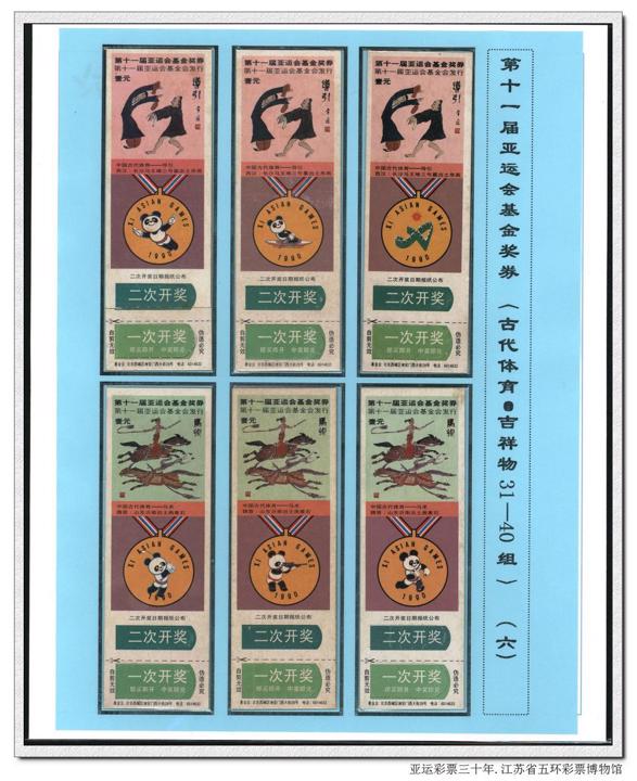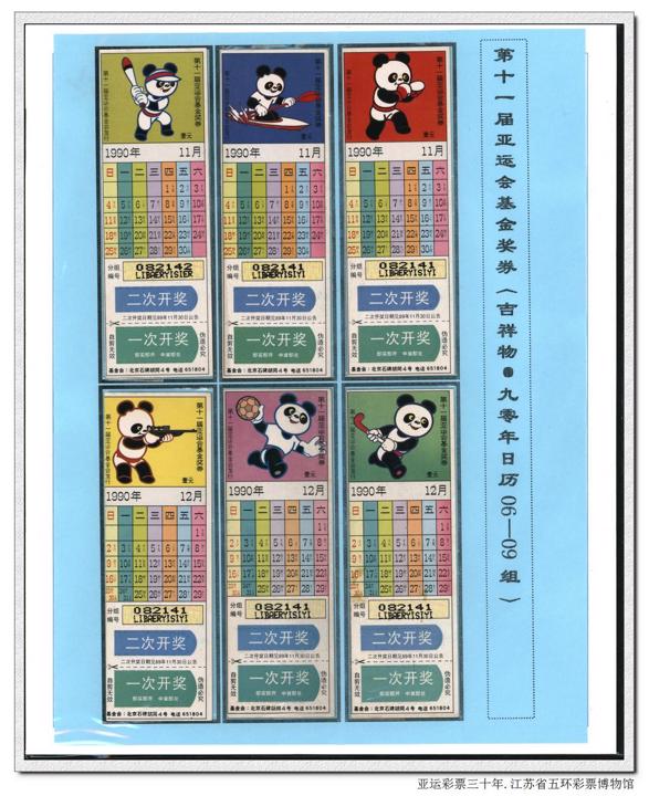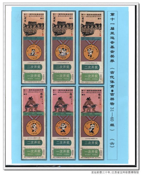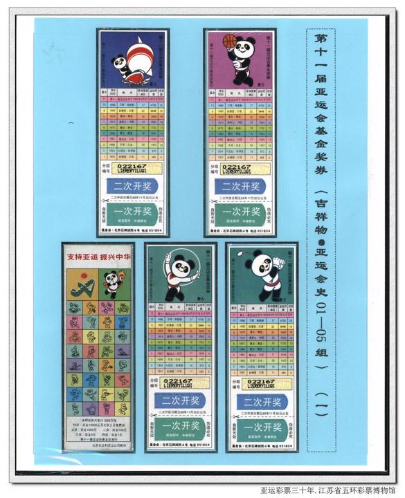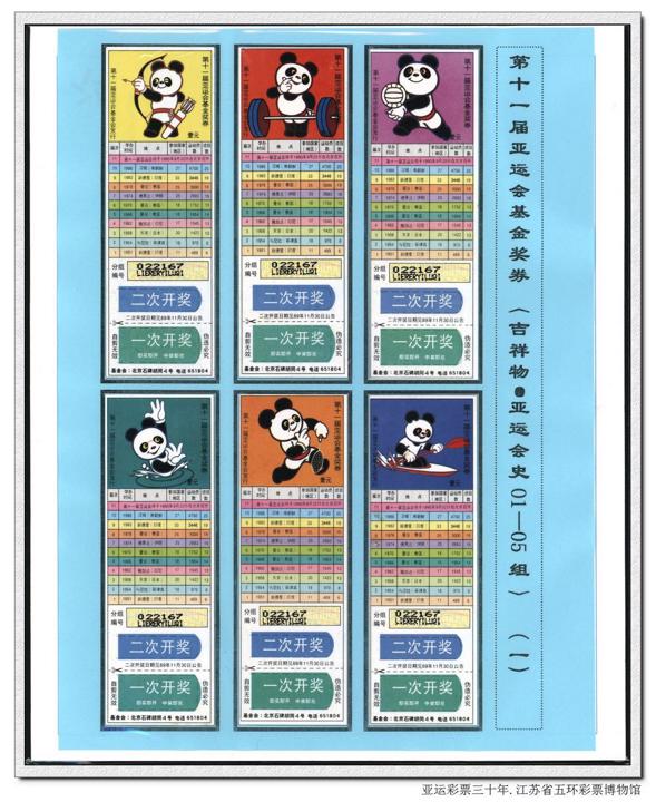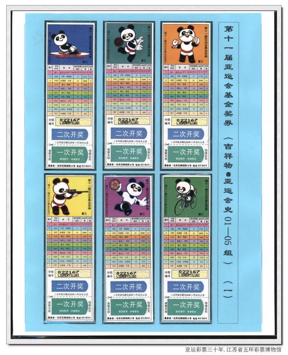 第一组彩票券面彩图采用的是第十一届亚运会会徽、吉祥物和比赛项目标志。奖券券首分别印制了亚运会会徽、吉祥物、比赛项目标志,共34幅图样。券面中间印有历届亚运会情况简介,下方为一次开奖、二次开奖的窗口,奖券背面分别印有这套奖券券首的图形,即34个形态各异,憨态可鞠的熊猫。这套奖券的设计,便于购买人搜集,可留作永久纪念,此版共印制5期计5040万张。