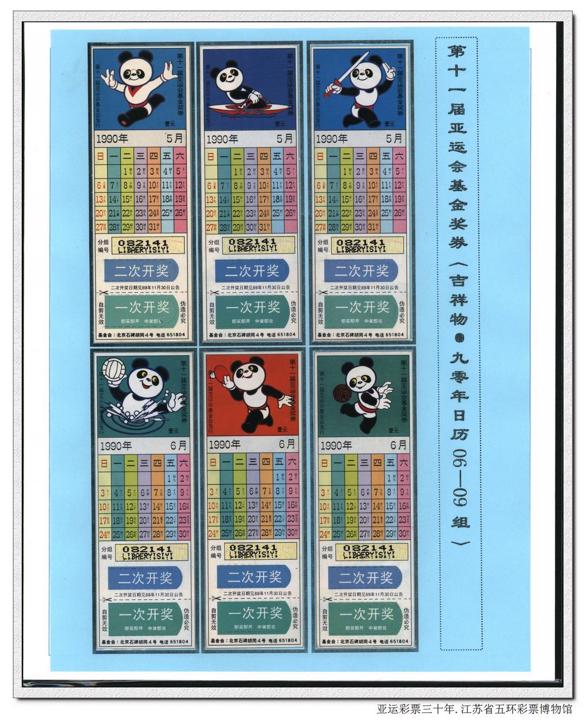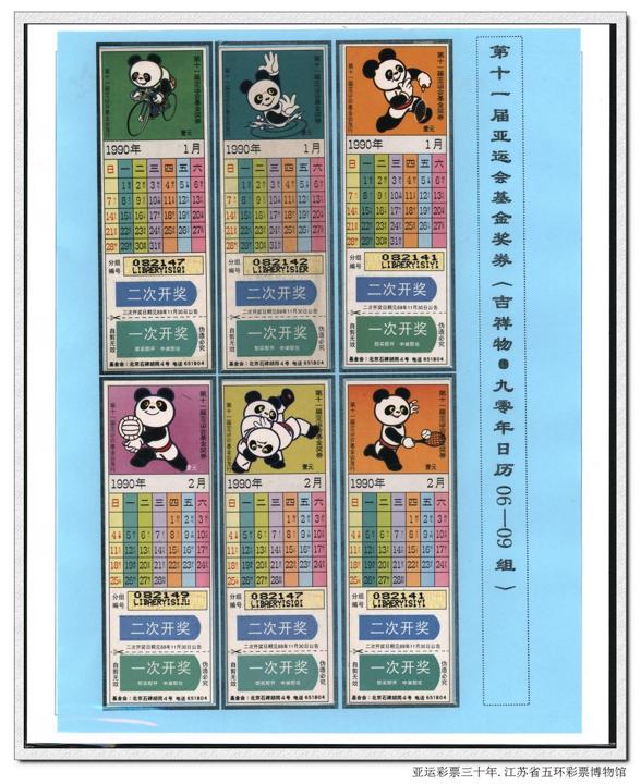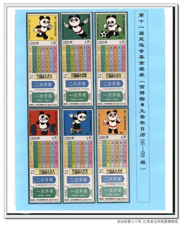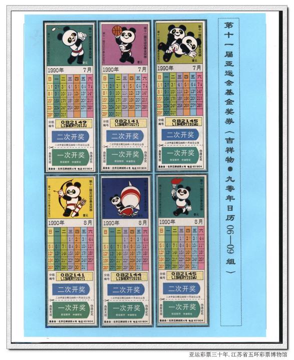 第二组彩票将这套群猫图奖券稍作变更,将券面中间介绍历届亚运会情况的部分改为1990年月历,每月一张,券面其他部分未作变化。改为印制月历,增加了奖券的使用价值。这版共印制4期,计4032万张。