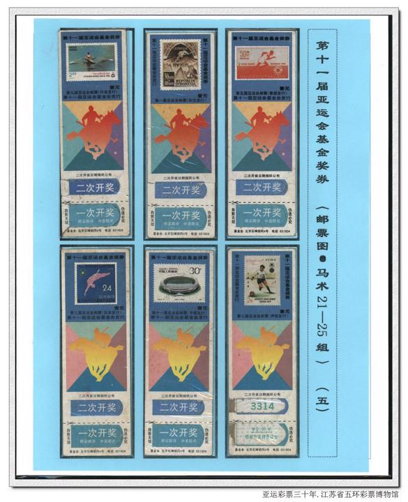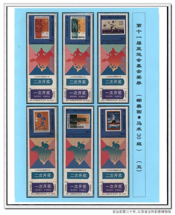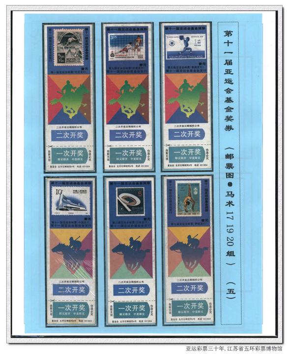 本组彩票的券面则分别印制了亚运会运动场馆,与前几种不同的是采用了横排式,规格尺寸没有变化,共设计了两版。第一版券首分别印制了大学生体育馆、石景山体育馆、朝阳体育馆、海淀体育馆、北京体院体育馆等亚运会运动场馆。奖券背面则是券面场馆的内景图,此版六张为一套,只印制了1期,共1008万张。