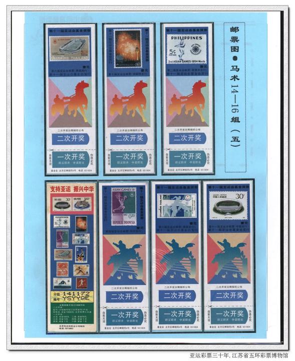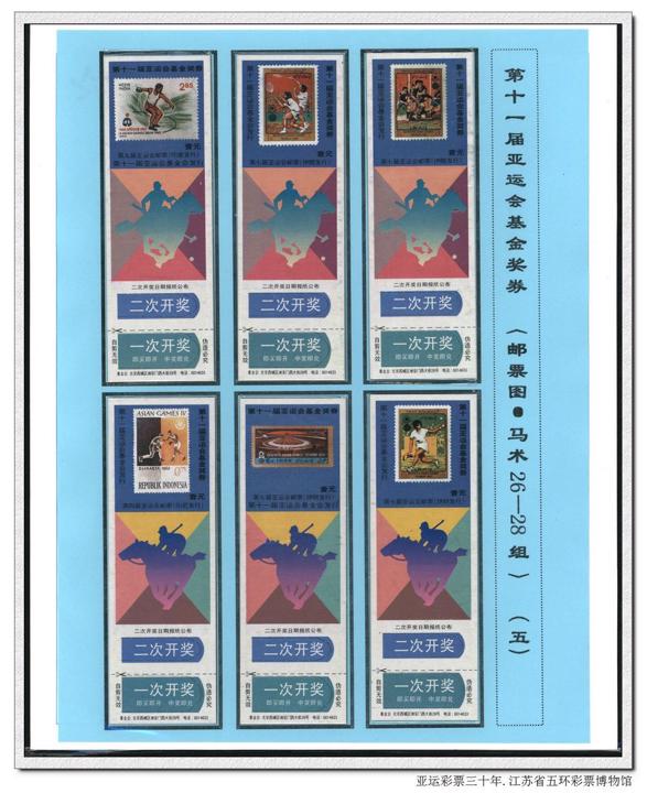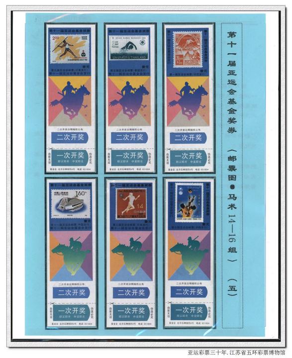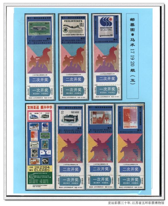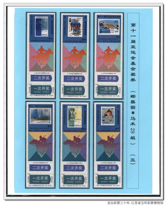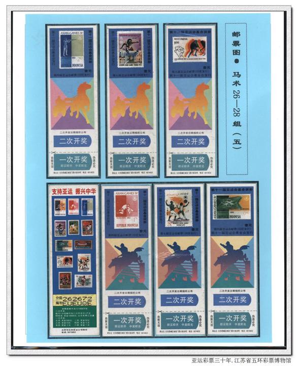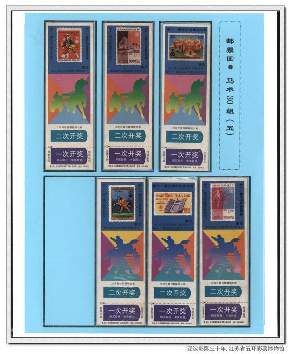 第二版至第七版奖券的中间部分印制了马术图,奖券下方为一、二次开奖窗口,背面也是券首的12枚邮票小样,六版共印制了16期,计16128万张。