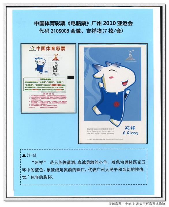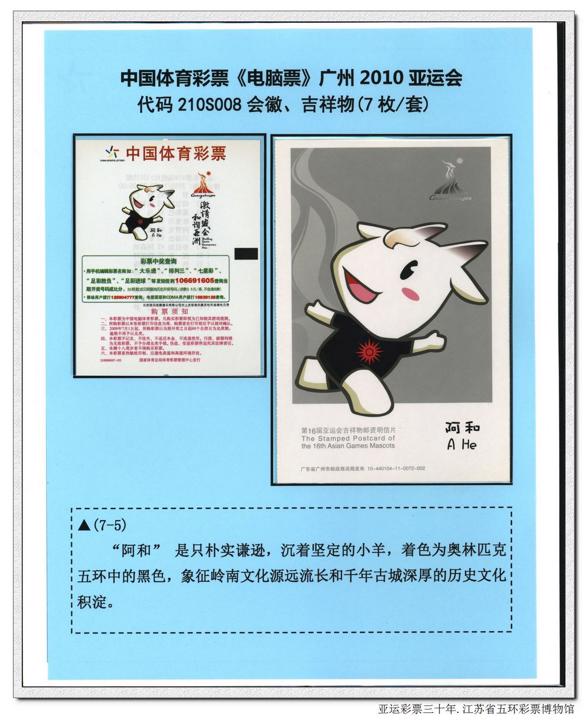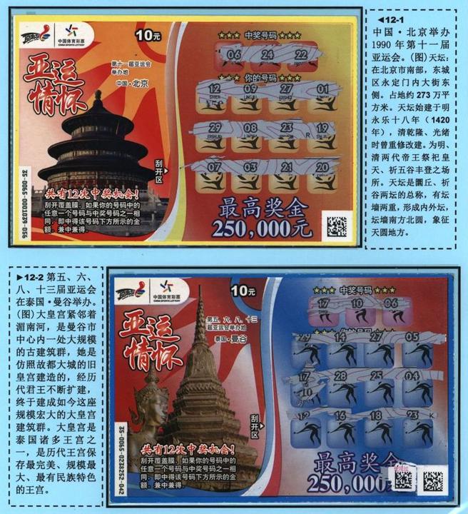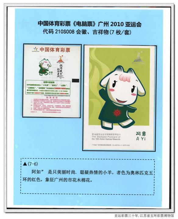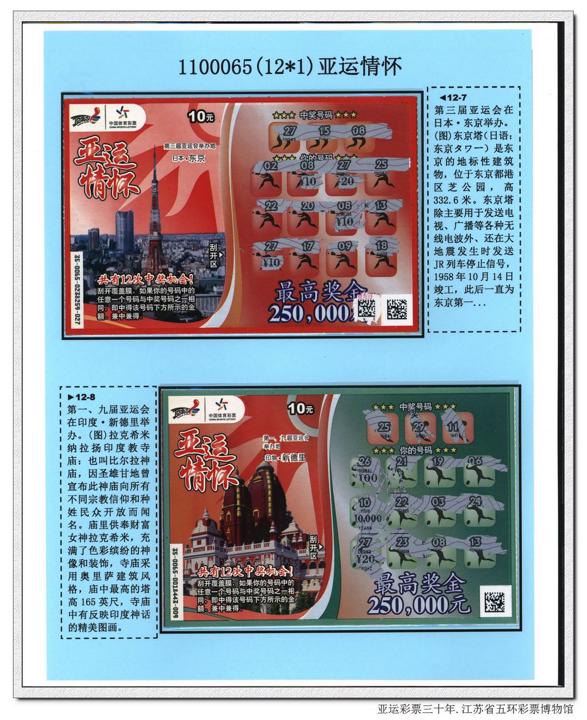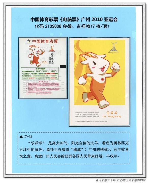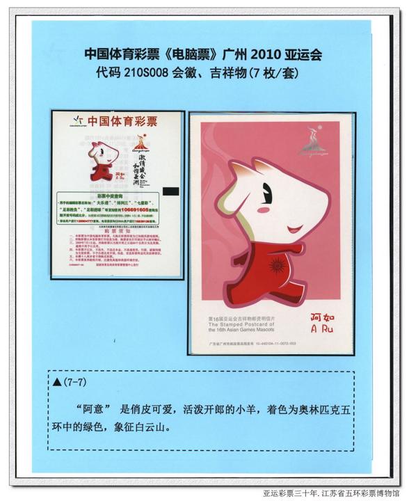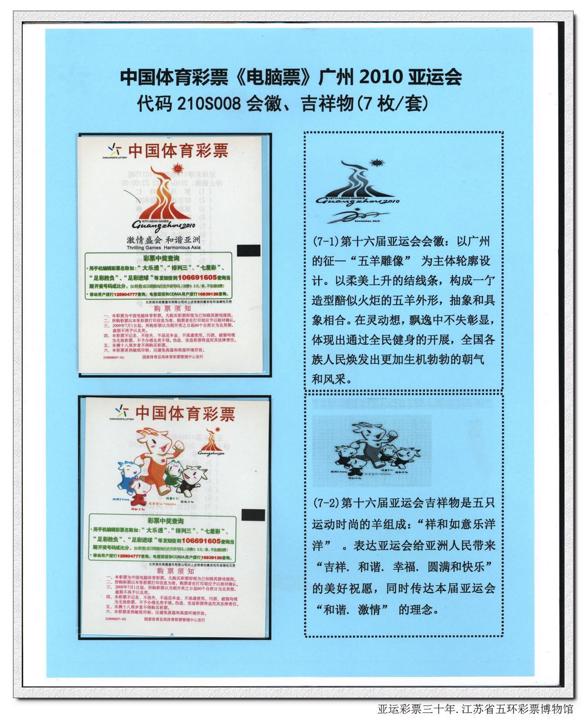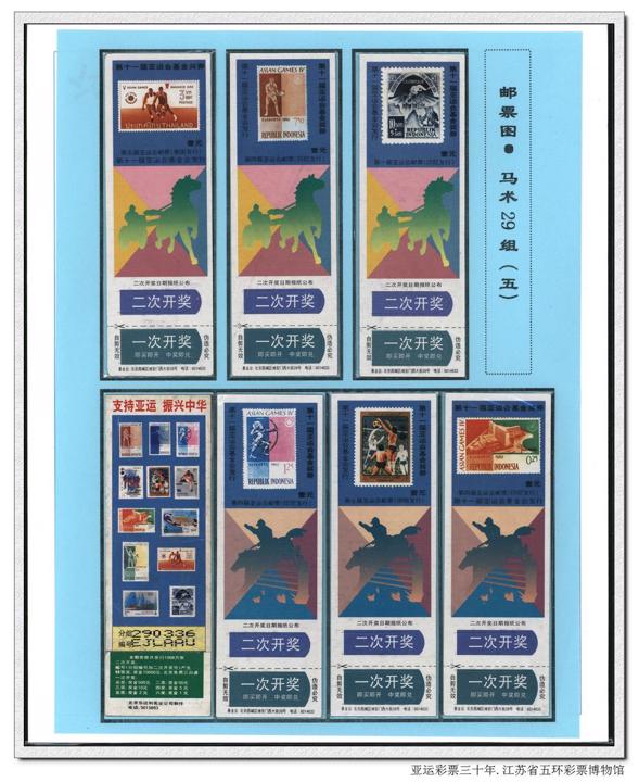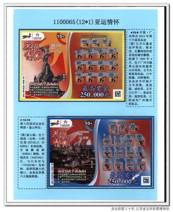 为了迎接亚运,中国体育彩票陆续推出了“激情盛会、和谐亚洲”、“写意岭南”、“亚运情怀”、“新新亚运”等几大亚运主题票,展现广州城市形象和亚运文化,彩票浓郁的岭南风情,受到了购彩者及收藏爱好者的青睐。