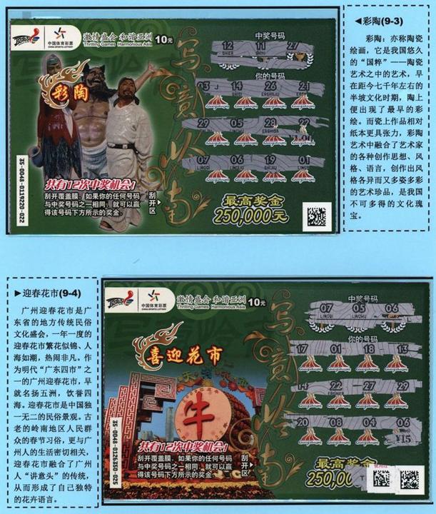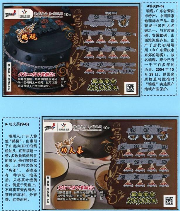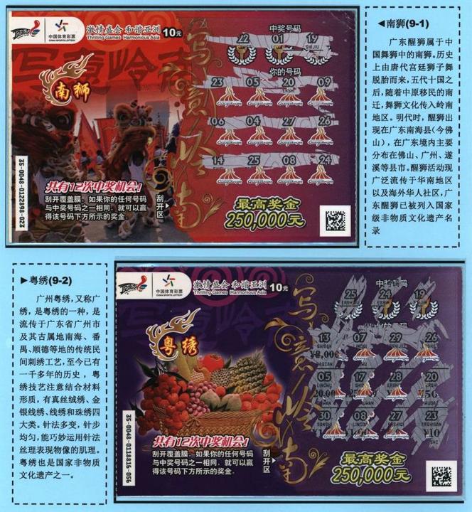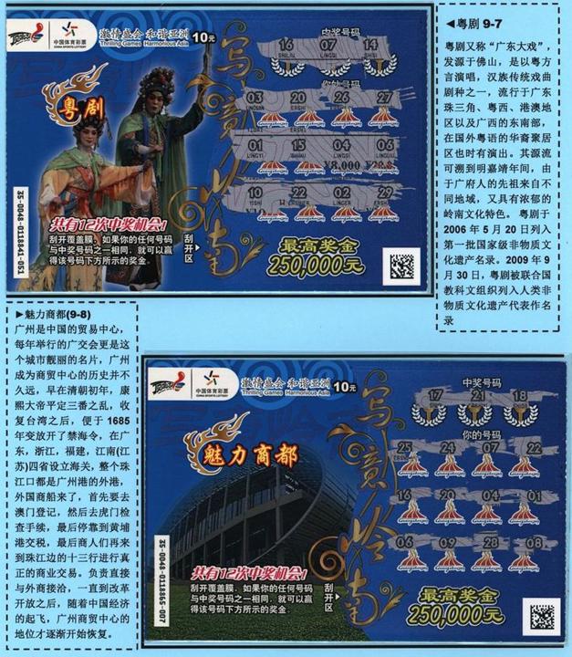 本组彩票编号1090048,包括“南狮”“粤绣”“彩陶”“端砚”“喜迎花市”“粤剧”“牙雕”“功夫茶”“魅力商都”共9枚,面值10元。