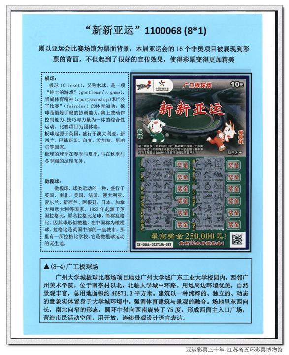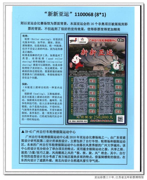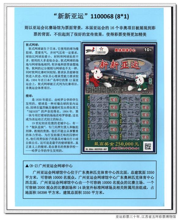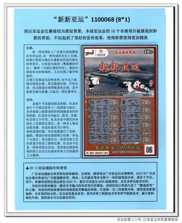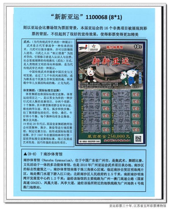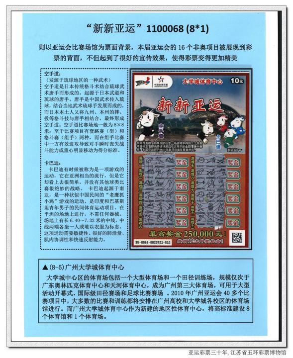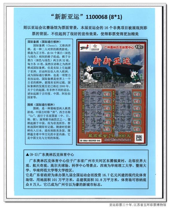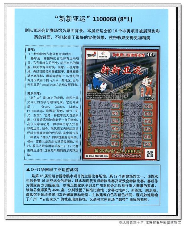编号1100068 (8X1)《新新亚运》顶呱刮彩票以第16届广州亚运会比赛场馆为票面背景,推介了本届亚运会的16个非奥运动项目,彩票票面精美,值得收藏。