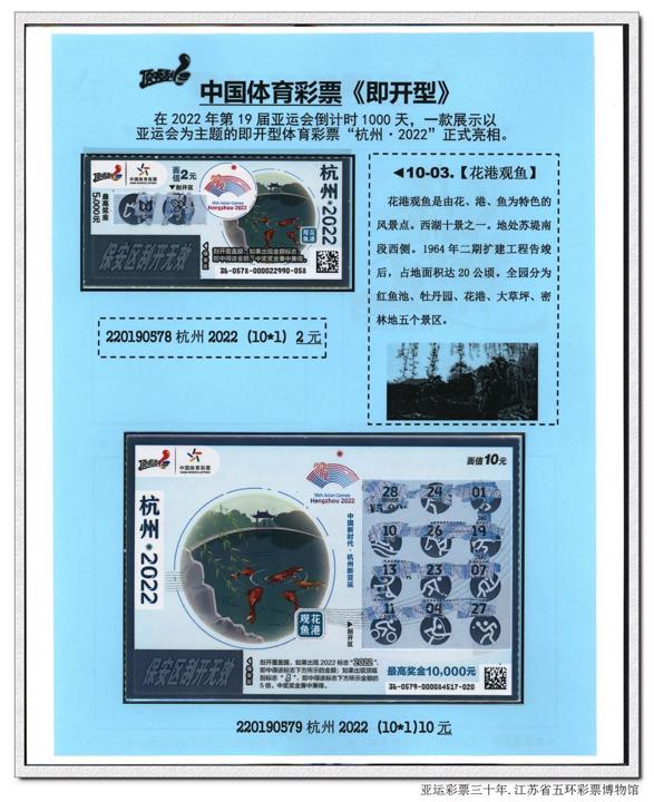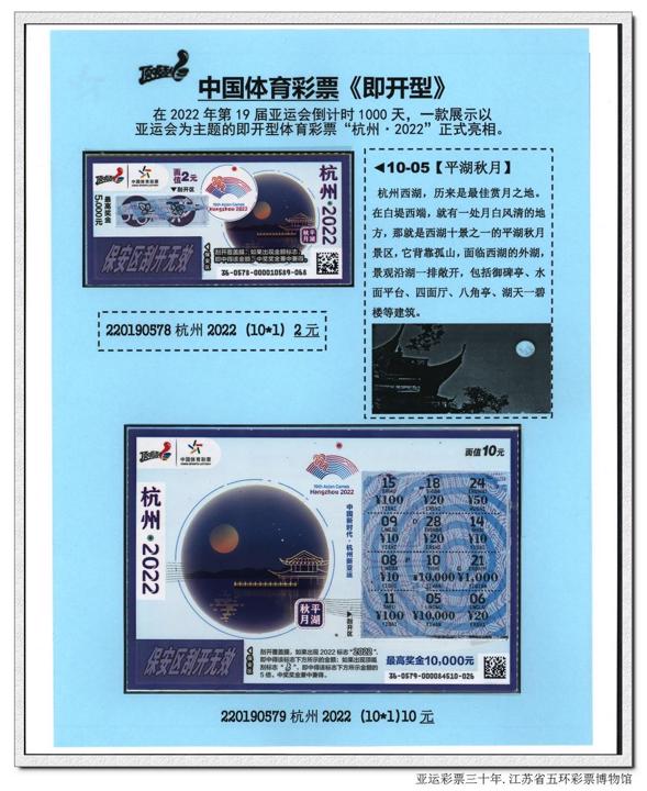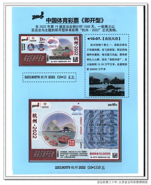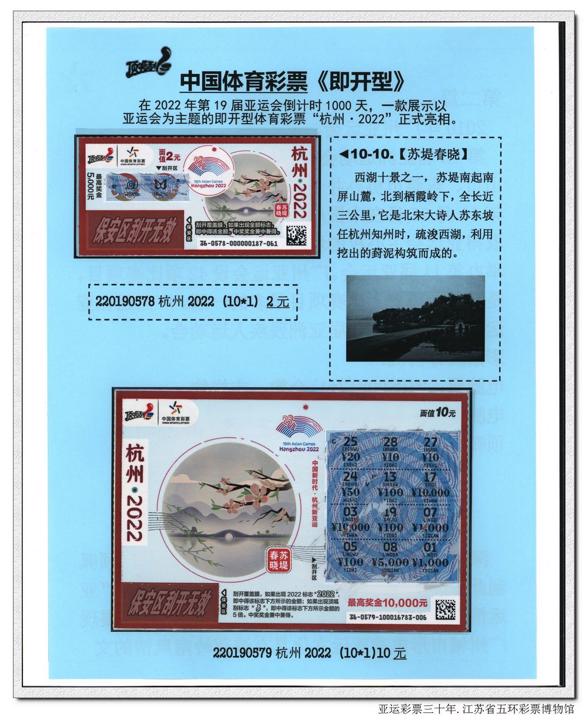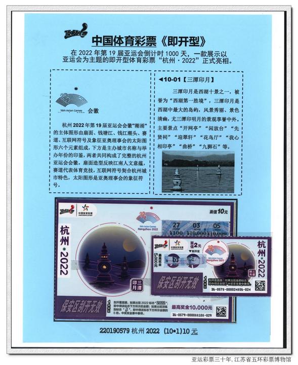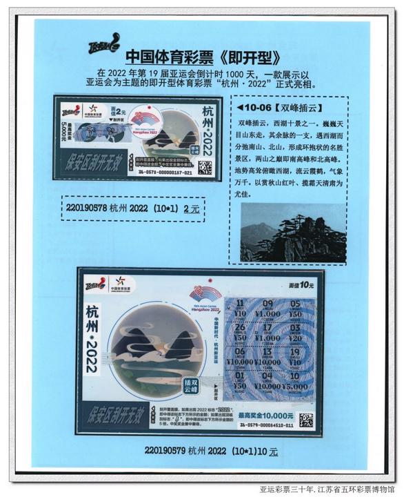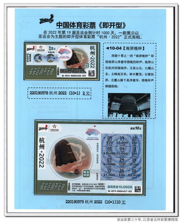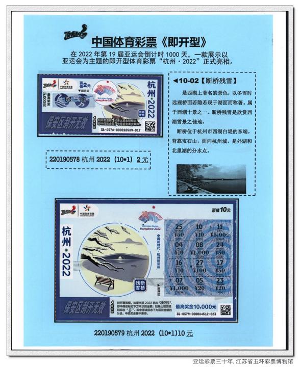2019年12月15日晚,在杭州2022年第19届亚运会倒计时1000天活动上,中国体育彩票杭州亚运会主题即开票——“杭州2022”在浙江上市。