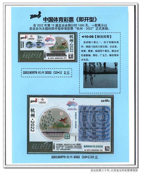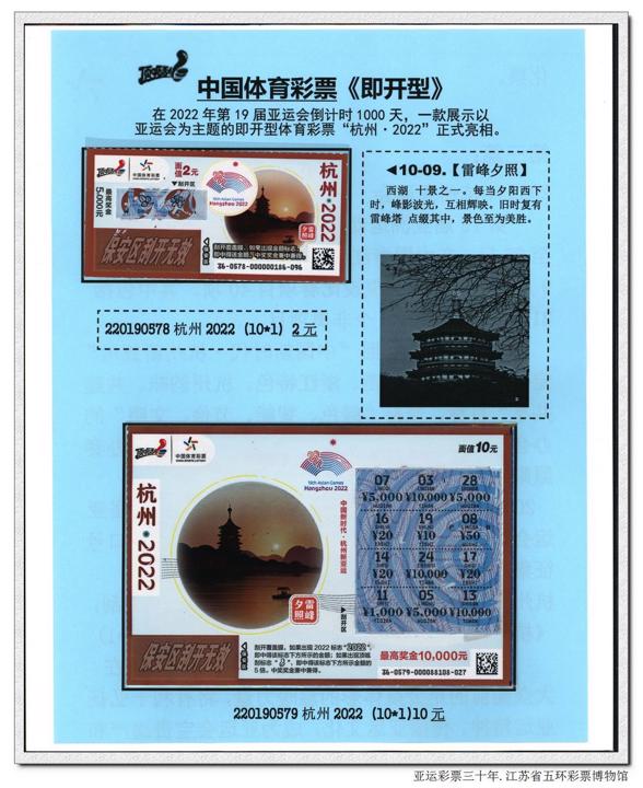 本组彩票票面分别以:苏堤春晓、曲苑风荷、平湖秋月、断桥残雪、柳浪闻莺、花港观鱼、雷峰夕照、双峰插云、南屏晚钟、三潭印月等西湖传统十景为设计元素,融入亚运会会徽“潮涌”,传递亚运会核心理念,展示西湖胜景精华,不仅好玩,还具有收藏价值。