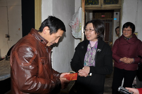 吴江区体育局是三村社区挂钩的结对单位,几年来资助了许多结对联系户和困难家庭。祝金宏老人从区体育局局长钱玮黎手中接过慰问品,开心地说:“体彩中心为我们困难家庭送来温暖,我们都很感谢,内心十分感动。”