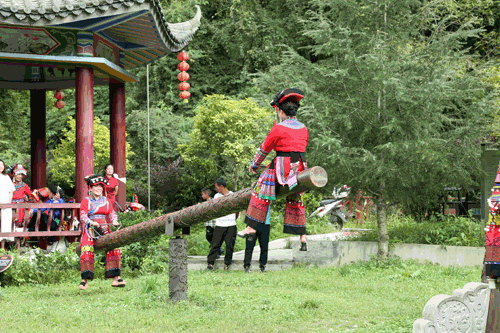 另外还有两种秋千。一种是观音秋,“彝语叫冲嘎烂,冲是指秋千,嘎烂彝语里是半山腰上分枝盛开的鲜艳花朵;意思是我们彝族姑娘在荡观音秋时,衣裳鲜艳,像山间盛开的花朵或像观音下凡一般美丽。”余二龙介绍道。