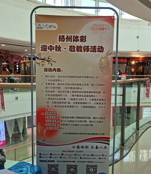 为庆祝双节,扬州体彩在地推现场开展系列活动:一、活动当天凭借教师证即可领取礼品一份(礼品送完即止);二、免费体验:现场关注扬州体彩微信公众号,每人可获赠价值10元即开票。(即开票送完即止);三、购彩抽奖:活动当天每人现场购买任意金额体育彩票,即可参与转盘抽奖一次。(即开票及礼品送完即止);四、消费满额赠:凭借当天商场任意商家消费小票赠送即开票。满91元赠送10元即开票,满191元赠送20元即开票,满491元赠送50元即开票,消费满910元赠送100元即开票。