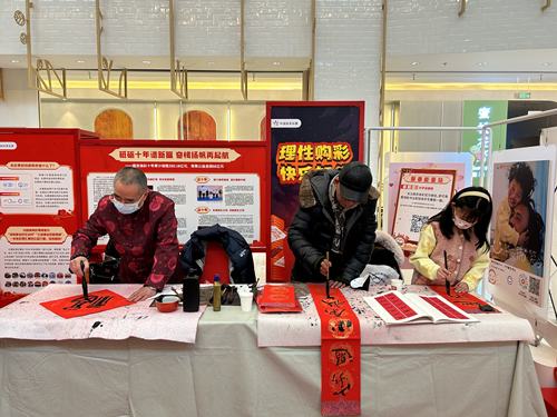 当然,现场还不止这些,在投壶游戏区,不论是大朋友还是小朋友都会上前试一试这传统的节日游戏,对于参加活动的市民,南京体彩贴心地为大家准备了丰富的新春大礼包。除此以外,下午16:00-18:30,南京体彩还特邀两位著名的书法大师亲临现场,为市民写“福”字、送春联。老师们挥毫泼墨,运笔自如,一张张饱含着祝福的福字,一幅幅吉祥如意的对联跃然纸上。在老师的鼓励和指导下,不少市民更是跃跃欲试,尝试自己创作春联。“以前的春联是花钱买的,今年在书法大师的指导下自己亲手写春联,感觉更有意义。”一位00后小伙子如是说。