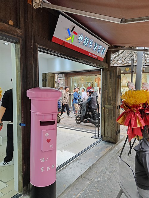 这家店网点号为3210030028,位于东关街西门街首第一家,中国体育彩票的门头于西门的古色古香相映成趣,韵味十足。网点的经营者是一群朝气蓬勃的年轻人,有想法、有闯劲、店内设计布局也充满了活力和出彩的“小心思”。