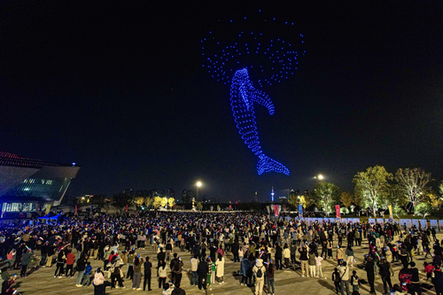 夜幕降临,“江天阔·无人机灯光秀”压轴上演,随着800架无人机不断变换十余种阵型,俏皮的江豚身姿灵动、宏伟的南京长江大桥光芒闪烁,课本《背影》里的火车站让人流连……20分钟的精彩表演,吸引现场上万观众抬头驻足观看。