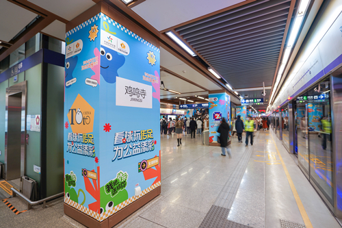 在南京地铁3号线与4号线的换乘站——鸡鸣寺站,南京体彩通过地铁包柱360°全方位覆盖进出站人群,在这人潮蜂拥的交通枢纽中心,向千万人展现公益体彩的魅力。