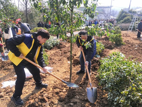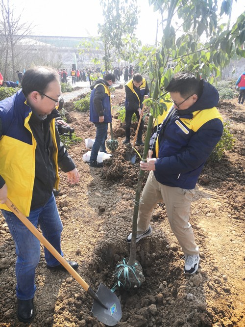 此次植树活动预先准备了350棵树苗,主要是香樟和樱花。在植树点,大家相互配合,分工协作,有的负责挥锹铲土、定点挖坑,有的负责扶树培土、浇水施肥,在大家的共同努力下,一颗颗小树苗迎风而立,为明媚的春日增添了一抹“绿”。