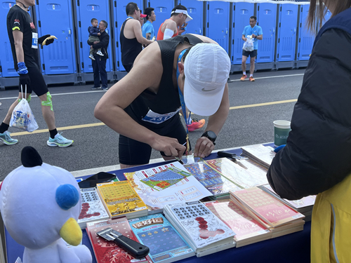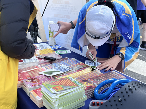 南京江北新区体彩积极借助此次“浦马”赛事契机,在半程马拉松终点“青春市集”开展公益体彩品牌推广活动,现场不但设置了醒目的体彩品牌宣传区,宣讲体育彩票的公益初心与社会责任,科普体彩公益金知识,还设置了顶呱刮即开票体验区,喜庆的即开票铺满了桌子,精美的票面吸引了众多跑友前来上手体验顶呱刮“一刮为快”的刺激和魅力。现场人头攒动,热闹非凡,大家在为自己赢取一份幸运的同时,也在用实际行动支持公益事业。