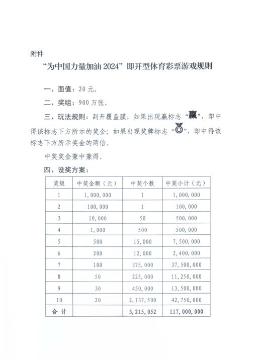 根据《财政部关于“为中国力量加油2024”即开型体育彩票游戏的审批意见》(财综〔2024〕25号)的有关要求,江苏省体育彩票管理中心将于2024年7月上市纸质即开型体育彩票“为中国力量加油2024”。“为中国力量加油2024”游戏主题为体育运动类,包含20元1种面值,5款票面设计。票面尺寸为100mm×200mm。
