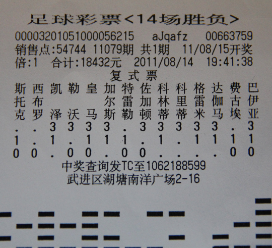 8 月 15 日开奖的体彩传统足彩胜负游戏全国共开出一等奖 15 注,每注奖金高达 1809405 元,江苏中出的唯一一注大奖花落常州武进区湖塘镇南洋商贸广场 2-106 号 54744 竞彩店!日前,该大奖得主陈先生已在省体彩中心领取了奖金。