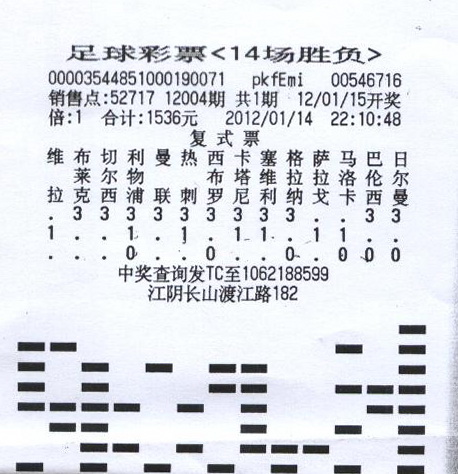 再看本期的中奖,小张本次中得的是12004期14场胜负,该票是一张1536元的单张复式票。一般来说,在没有倍投的情况下,全部命中也只能中出1注一等奖,但该期赛事出现一个小插曲,当期14场赛事中,意甲的“卡塔尼亚对罗马”这场赛事因天气原因推迟,按照规定该场赛事无论任何竞猜结果均视为猜中。小张恰巧在这场比赛选择了双选,这样就出现了难得一见的中奖奇观——在没有倍投的情况下获得双倍奖项,即2注一等奖,18注二等奖,总奖金达到306万元。值得一提的是,当期赛事为“英西意法”四国联赛,劲爆多场冷门,即便取消了一场赛事,竞猜难度也没有降低,一等奖单注奖金达到了134万元。