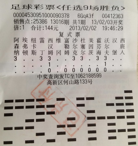 足彩胜平负13016期,沙尔克主场负于菲尔特,成为当期超级大冷门,当期14场一等奖全国无人中出,任九场全国也只中奖246注,单注奖金高达53361元。