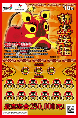 老虎自古以来便被誉为“百兽之王”,现代人通常只有在动物园中才能一窥其英姿,不过依然深深敬畏其霸气。和现实中的老虎相比,顶呱刮2010年贺岁票、10元票种“锦虎送福”上的老虎可要可爱多了,在“锦虎送福”三种不同颜色的票面上,老虎形象结合了民间趣味,各有各的特点:紫色票面上的老虎活泼可爱,红色票面上的稳重老成,绿色票面上的则是灵气十足。“锦虎送福”登陆我省不久便已为彩民送出了4个25万大奖,虎年新春再过一个多星期就将来临,相信彩民们虎年之中必定“虎虎生威”,再刮出更多大奖也是指日可待!
