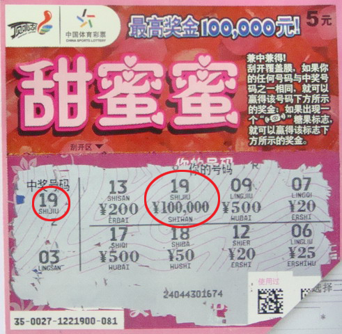 2月24日下午,中心迎来了幸福的一家人。兑奖台前,妻子掏出了一张“甜蜜蜜”中奖票,一看,所中奖的号码对应下方清晰的显示出“¥100,000”的中奖金额。就这样,“甜蜜蜜”又一10万大奖诞生了!这个从问世至今产生过多个头奖的即开热销品种,再一次让我们南京彩民“甜蜜蜜”的尝到10万的喜悦滋味!