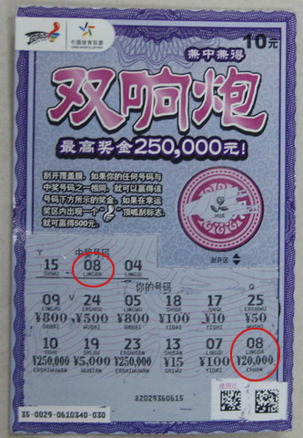 无独有偶,3月5日,赵先生(化名)买完七位数,见站点内陈列着新到的即开型彩票,过去极少购买即开彩票的他很快被这些花花绿绿的彩票吸引住了。于是先试探性买了1张“双响炮”,刮开后中了10元,尝到中奖的甜头后,他又买了1张“双响炮”,当刮至最后一个号码时,他惊喜地发现“中奖号码08”和“你的号码”中自己刮出的号码“08”完全相同,仔细刮开下面的奖金区域,奖金的数额更是令他喜出望外,竟然是2万元大奖。