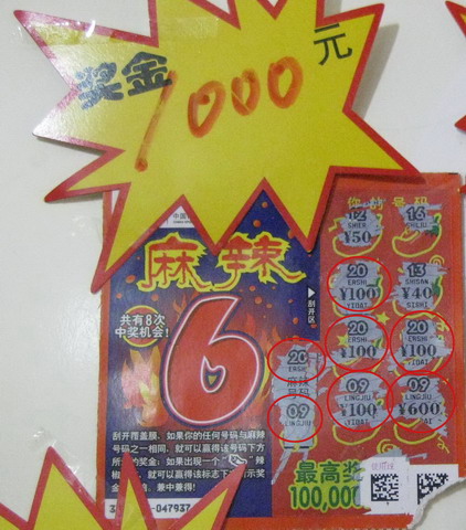 老李的话,激烈了大家,都想摩拳擦掌试一试,其中最年轻的小伙小赵一眼看中了五元一张的麻辣6,“师傅,我就要这一张小辣椒。”小赵把麻辣6改叫小辣椒了;老李熟练地拿了一张,刚一转身,就听小赵惊呼了一声,“我中啦!一百块啊。”大伙都凑了上来,又一声“哎呀,又中了一百块”,这时大家都围在一起屏神静气的看着小赵手上的“小辣椒”。小赵小心翼翼的刮着,又出来两个一百块。大家的心都揪在一起,最后一个会是什么呢?只见小赵闭上眼睛,深吸一口气,亲吻了一下“小辣椒”,伸出手中的硬币,慢慢的刮着最后一个数字,“又中啦!”他用颤抖的手刮向底下的中奖金额,“哈”他呼了一口气,如释重负,“六十块”。大伙都在一起起哄:“小赵晚上你请客啊!吃火锅去,再次麻辣一下,哈哈!”这时一向沉稳的老李,拿着那张“小辣椒”,左看右看“小伙子,等一下。”“怎么啦?”大伙都用诧异的目光看着老李,以为刚到手的大奖没有了!这时只见老李,用大拇指刮向60后面的覆盖膜,奇迹出现了,60后又出现一个0。“哇,老师傅,太感谢你了”,小赵一蹦三尺高。赶紧从身上掏出香烟来:“老师傅,今天太谢谢您啦!晚上吃饭一起来啊!”老李悠闲地点起一支烟:“年轻人,好东西都是最后才出来的啊”。嗯嗯,小赵头点的像小鸡啄米似的,兴高采烈地领走了1000元大奖。