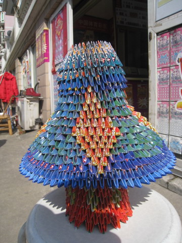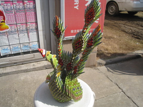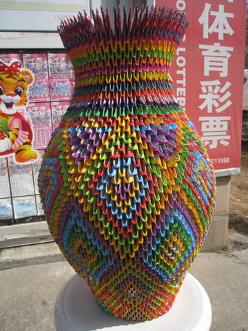 该站点(11068)位于镇江丁卯桥路瑞泰星城小区内,以上所说的那些精美工艺品出自业主朱先生之手。他告诉笔者,自打“顶呱刮”上市以来,就非常受欢迎,站点每天总能有不少废弃的彩票,扔了实在可惜,自幼就喜欢手工艺品的朱先生,只要一有空就开始完成体彩工艺品的制作。刚开始只是简单的小笔筒、小盒子,然后是花瓶,到后来就是栩栩如生的天鹅、孔雀,时间久了竟然上了瘾,名气也越来越大,经常有附近彩民上门讨要他的作品。朱先生指着一只高60公分宽40公分的大花瓶,说:“它花了我一个月的时间,用了一万多张彩票呢!”