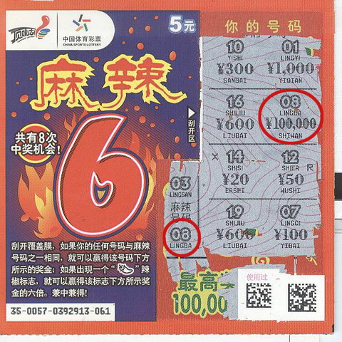 小何和小赵是同乡也是好朋友,他俩都爱好刮体育彩票,而且两人还有一个共同的买彩口号——买体彩就是买希望。3月13日中午,两人途经昆山张浦镇商涣路05481体彩销售站,因为最近小何刚结婚,趁着新婚的喜庆小何打算试试手气,而小赵则想沾沾小何的喜气,于是两人走进了体彩店。看到 “麻辣6”票面喜庆,小何便要了4张,只可惜这4张都没中,于是就再要了一张。当刮开“中奖号码”为“03、08”而“你的号码”中出现“08”时,小何心中一喜,激动地刮开下面的中奖金额。令所有人都没有想到的是,小何轻轻一刮,刮开了他的大奖梦想,也刮开了05481站点的第一个10万元大奖,顿时体彩点沸腾了!中奖后的小何第一反应就是打电话把这个好消息告诉新婚的妻子。