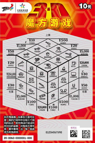据了解,“3D魔方游戏”每张面值为10元,最高奖金25万元。该票种的游戏方式借助了魔方这一有趣的形式,游戏区分为“上、左、右”三面,每一面中都有“3列+3行”即6次中奖机会,如此算来魔方的三面事实上为彩民提供了多达18次的中奖机会。该票种玩法简单新颖:刮开覆盖膜,如果在魔方的三面中任意一面的行或列中出现三个相同的标志,即中得该行或列中所对应的奖金。不过需要提醒彩民的是,只有成行或成列的三个相同标志可以中奖,对角线刮出三个相同标志不算中奖。
