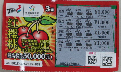 许多人这个三元的、那个五元、十元的“顶呱刮”挑了起来,大家一起刮,闹一闹、笑一笑,希望有个好运气中大奖。吴先生以前买7位数、大乐透的时候看到过人家买,自己倒是从未买过“顶呱刮”,这会儿被这热闹的气氛感染了,在销售人员的耐心解说下,掏出3个硬币购买了一张“红樱桃”彩票试试手气。没想到刮开兑奖区碰巧也是中到个3元钱。在销售员的鼓励下,吴先生决定再换购一张“红樱桃”试试运气,刮开兑奖区后,吴先生看了看彩票不是很确定,于是问销售人员:“你帮我看看这样是不是中4000元大奖了?”“哎呀,没错,每行都是红樱桃,每行对应的奖金都是1000元,一共就是4000元,‘满堂红’,运气真好啊!”