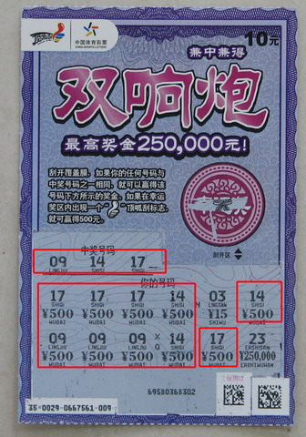 中奖者潘先生是位直爽人,一谈起彩票来就头头是道。他说自己是个忠实的刮奖迷,每天下班经过销售点都要进去过过瘾。25日晚上下班后直接来到销售点,潘先生随手抽了两张彩票,迫不及待刮着,刮开第一张没有,刮第二张时,嘴里不停的唠叨:今天没有了,明天再买吧。刚唠叨完,就发现这张“皇牌多多”中了50元,潘先生觉得自己这天手气不错,就把老板没刮完的“双响炮”拿过来刮,刮到第二张就发掘出了个5000元大奖。“运气实在太好了!”潘先生兑奖时仍然非常兴奋。