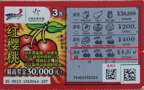 邵女士(化名)跟丈夫都是体育彩票的追随者,不过这两位走的是不同战线,一个疯狂迷排3,超级大乐透,一个则是对“顶呱刮”情有独钟。邵女士说,每天晚上两个人吃完晚饭都会出门散步,散步的起点是家,终点则是体彩站点,说到这里,邵女士说晚上如果朋友到家找不到人的话就会沿着那条路线找去站点,因为这夫妻俩不是在体彩点,就是在去体彩点的路上!谈笑中不难感受到夫妻俩对体育彩票的热衷。30日晚上,邵女士也是跟丈夫一起,一到站点就坐定在桌前开刮了,这天选的是“红樱桃”,买了十张,到最后第二张的时候她已经有点灰心了,想着看来今天没有大奖了,结果就是这张票的最后一行游戏区出现了3个樱桃,,奖金4000元!这可把夫妻俩高兴坏了,乐颠颠的就拿着中奖彩票回家了。