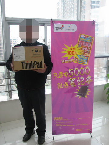 得知南京首台笔记本电脑得主“降临”,体彩中心的工作人员都去向江先生表示祝贺。中心主任亲自为他颁发联想集团提供的ThinkPad笔记本电脑一台,“江先生是南京的首位幸运儿,希望借着他的好运,能有更多的人领走我们的‘超值大礼’。”