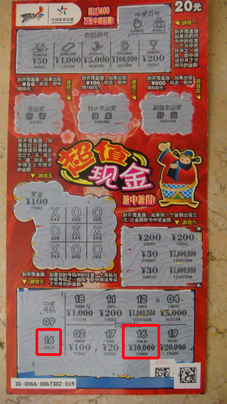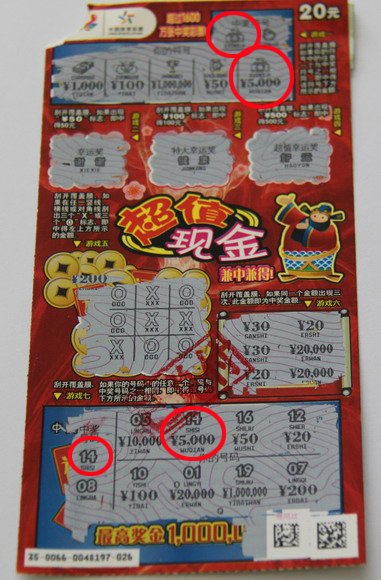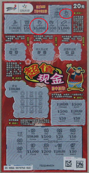 在交谈中了解到,胡先生平常最爱买“顶呱刮”,尤其偏爱10元票和20元票,最近看到铺天盖地的“超值现金”广告,他当然是不甘落在人后,那天花了60元先买了三张,其中刮出两张票奖金都是20元,于是就换了两张,结果换来的一张票里面,游戏一就刮出了两个相同的钻戒图案,对应的奖金5000元!这可把胡先生高兴坏了,叫上朋友就赶到市里面来领奖了!