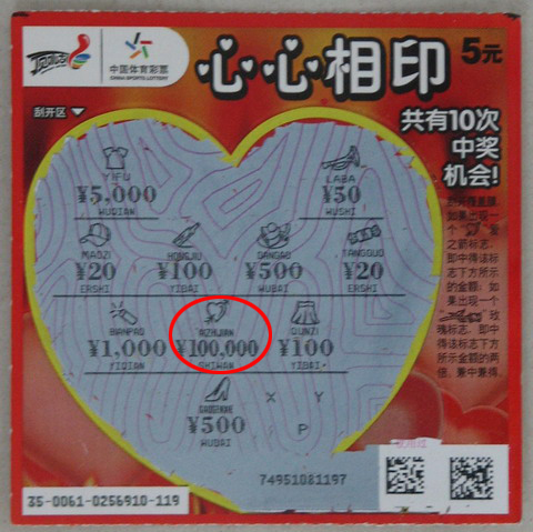 来自常州金坛的徐小姐29日购买两张“心心相印”成功中得十万大奖!徐小姐平时喜欢买即开型体育彩票“顶呱刮”,每次买的都不多,总是控制在50元以内,相当理性,之前刮票总是小奖不断,新奇有趣的刮票体验给她带来了很多快乐。29日,徐小姐跟往常一样走进了体彩点,由于最近婚期将近,所以看到红彤彤的“心心相印”时特有感觉,“我就是看中了它票面喜气甜蜜的感觉,买了两张,第一张没刮出奖金,第二张一刮就看到了一颗心,乍一看还以为是100元,给销售员看了一下,销售员比我还兴奋,这哪是100元,这是十万!当时真的能听到心怦怦跳啊!
