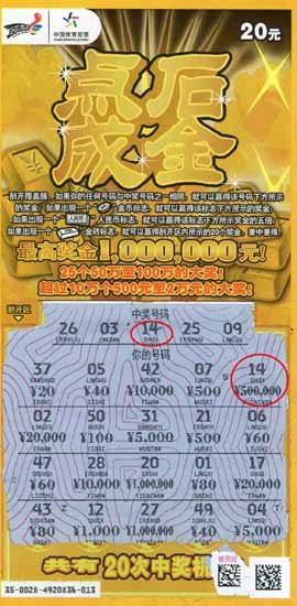 7 月 6 日下午,一位年轻小伙子在两位朋友的陪伴下来到徐州市体彩中心兑奖大厅,一看这位小伙就是个铁杆球迷,身着一身运动装,当旁边的彩民看到他手中的那张“点石成金” 50 万元中奖彩票时都羡慕不已,当问起小伙的中奖经历时,他笑着表示,他是个铁杆球迷,非常喜欢足球,特别是世界杯期间每场必看,而 53501 竞彩店更是他经常去的地方。在南非世界杯 1/4 决赛开赛前夕,由于采用倍投方式猜中德国 - 西班牙这场比赛结果,获得奖金 1280 元,随后用 80 元买了 4 张点石成金,没想到幸运中得 50 万元大奖!”