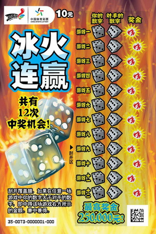 有时不得不承认票面的设计对于即开型彩票来说实在是太重要了,无论从票名还是票面整体设计上来看,“冰火连赢”都可称得上顶呱刮近期以来不可多得的佳品。首先票名起的就很酷,叫起来也朗朗上口,再看票面,整个背景虽然以橘黄色的火焰为背景,但晶莹剔透的两个冰骰子点缀其中,盛夏之中无比清凉。