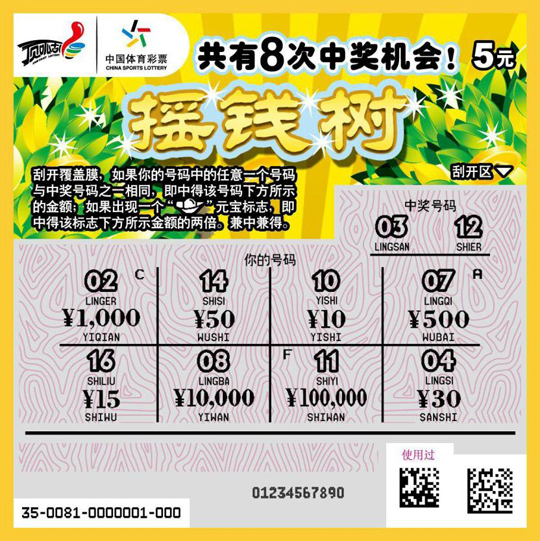 “摇钱树”是我国民间传说中的一种宝树,据说摇一摇就能掉下钱来,而用“摇钱树”作为票名再恰当不过,充分显示出体彩顶呱刮的游戏特点,每一个刮奖的朋友把玩游戏的过程不就是在寻找自己心中的“摇钱树”吗?该票每张 5 元,共有 8 次中奖机会,最高奖达 10 万元。“摇钱树”的票面颜色搭配非常悦目,黄色为主色调,背景为两颗郁郁葱葱的长满铜钱的“摇钱树”,中奖号码的覆盖膜是两个钱袋,而你的号码覆盖膜是 8 个金砖堆。刮开覆盖膜,如果你的号码中的任意一个与中奖号码之一相同,即中得该号码下方所示的金额;如果出现一个元宝标志,即中得该标志下方所示金额的两倍,兼中兼得。