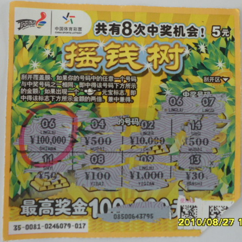 8月26日这一天,小沈下班后和一帮工友照例又来到05970体彩销售点,买了几张“摇钱树”。中出了两个5元,正当大家认为小沈要转身离开时,他再次用两张中奖5元彩票换了两张新票。销售员问他是否要换一个品种时,小沈坚决地说:“不要换品种,就接着下去换两张‘摇钱树’”。第一张刮开后无奖,第二张中奖号码有“06”,刮开你的号码区后发现也有个“06”,而这个“06”下面的奖金是“100,000”字样。小沈一高兴误认为是100元,就高兴地对销售员说:“我中到了100元。”正忙碌的销售员接过彩票粗略地看了看说:“好象不止100元,至少1000元。”当销售员缓过劲来开始认真地数了起来,1后面一共5个0,销售员高兴地大喊:“你中了10万元。”小沈有些不敢相信自已的耳朵。彩票在许多彩民手中传递着,最后大家一致肯定是10万元。小沈高兴地说:“我终于摇到了金元宝了,要淡定、淡定,理性购彩很重要哦。”小沈的一帮工友情不自禁地为他鼓起了掌。执着的“一根筋”终于捧得了10万元大奖。(徐之龙)