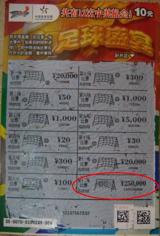 “这张‘足球盛宴’是我最后刮中的,前面11场比赛球都没有进球门,我还在安慰自己那天是去过‘顶呱刮’瘾的,没想到,最后一场比赛‘进球’了!”周先生所指的“进球”,就是“足球盛宴”的玩法,只要任意一场比赛中,足球射进球门,就中得右边的奖金,而周先生刮开奖金区的时候他自己都愣住了。