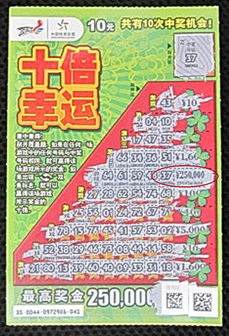 9月22日中秋节晚上,由于只有两人过节,小李就请老婆到外面餐馆吃了一顿大餐。用餐结束后,两人就在街上散步。在路过一家体彩销售店时,老婆心血来潮指着体彩店说“我们买张彩票吧。”边说着,边拉着小李就往里走。当他们进到店里,就被眼前花花绿绿的即开彩票吸引了,在询问了销售员一些即开彩票的基本知识后,夫妻两人一商量,掏出10块钱买了一张“十倍幸运”。等他们把刮开区全部刮开,小李竟在密密麻麻的数字中发现了一个与中奖号码一样的数字,在销售员的指导下,小李再把后面的奖金刮开,竟然是最高奖25万元。两人向销售员反复确认后,才相信了中奖的事实。